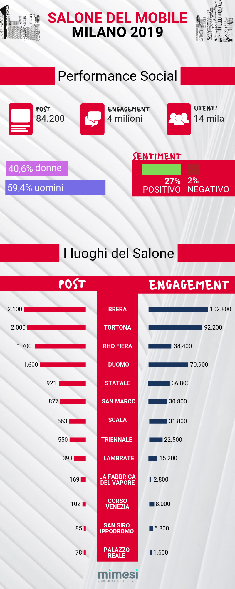 Come lo scorso anno, abbiamo monitorato le performance social. Dall’8 aprile, giornata d’apertura del Salone, sono stati pubblicati 84.200 post sul tema con un engagement di 4 milioni. Anche online il mood nei confronti dell’evento è stato più che positivo: infatti il sentiment negativo sul totale dei contenuti postati è stato solo del 2%. A postare di più sono stati gli uomini, il 59,4% rispetto al 40,6% delle donne. Brera si conferma anche sui social il “district” più apprezzato, con un numero di post pari a 2.100.