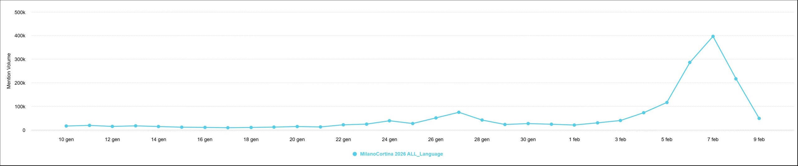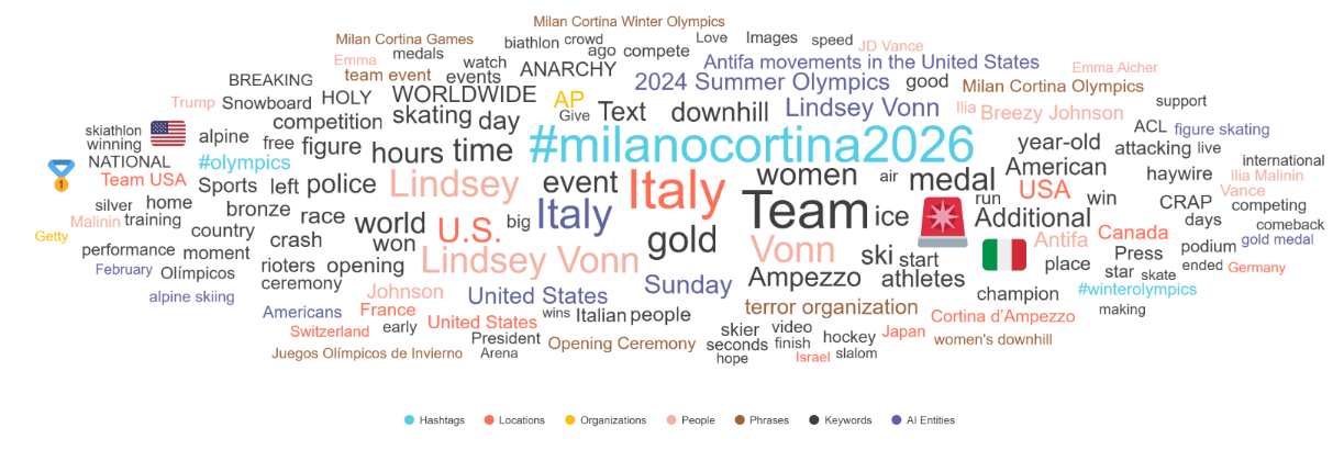 Le word cloud e le analisi semantiche evidenziano come termini legati a Milano, Cortina, Italia, Lindsney Vonn, gold e team, dominino la copertura mediatica, confermando che l’attenzione si sta spostando verso gli aspetti sportivi.