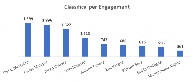 Pierre Marcolini è il leader incontrastato e ottiene le performance migliori (engagement di 1.999) grazie a un grande bacino di fan, mentre sul secondo gradino del podio troviamo Carles Mampel (engagement di 1.896) e Diego Crosara (engagement di 1.627) che ottengono buone performance grazie a contenuti molto accattivanti che gli permettono di avvicinarsi al leader pur avendo delle basi di fan più limitate.