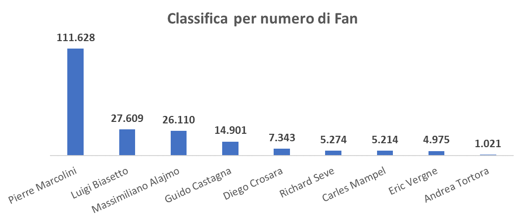 Pierre Marcolini domina la classifica dei follower con ben 111.628 fan, seguito da Luigi Biasetto (27.609) e Massimiliano Alajmo (26.110).