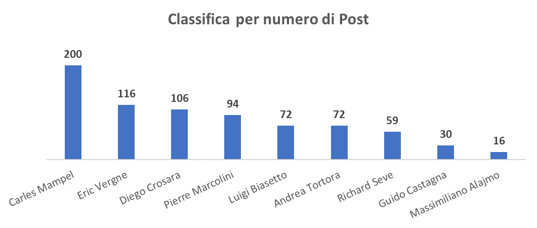 A livello quantitativo, con 200 contenuti postati in un solo mese, è Carles Mampel a sbaragliare la concorrenza, seguito da Eric Vergne con 116 post e Diego Crosara con 106 post.