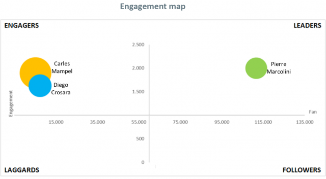 • Carles Mampel e Diegro Crosara: grazie all’ottimo tasso di like e condivisioni ottenute dai loro post, si posizionano nel quadrante degli Engagers, nonostante una base di fan limitatata.